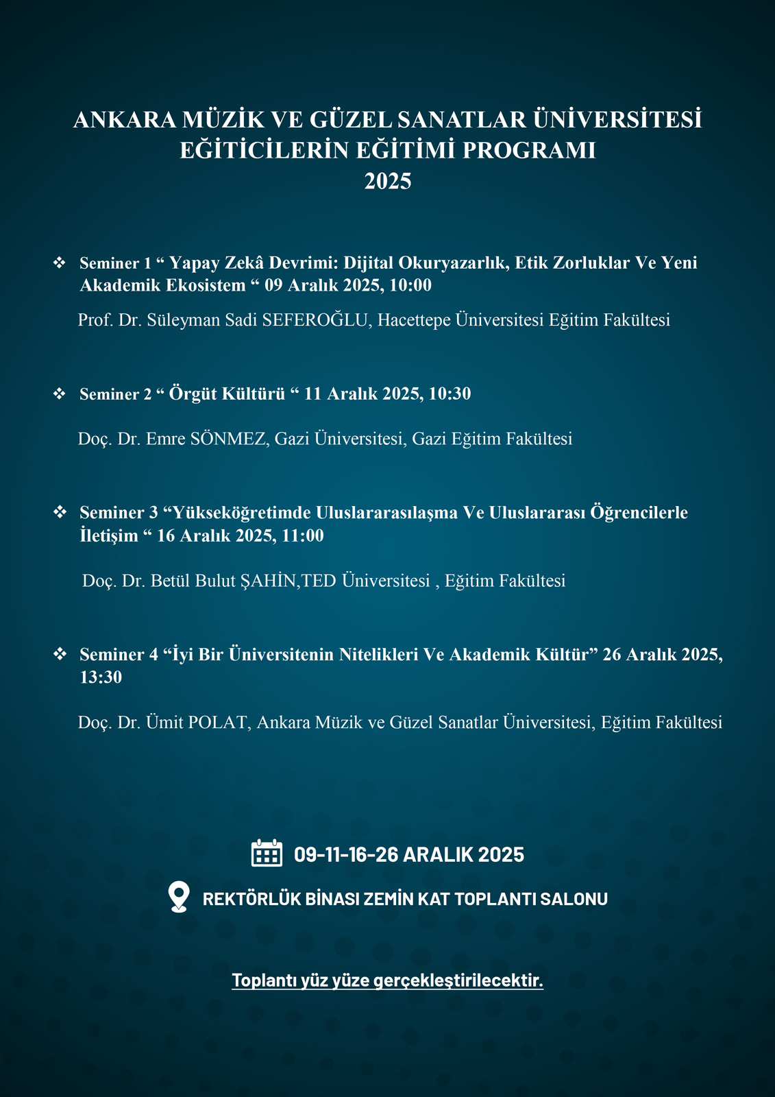 Program yüz yüze düzenlenecek olup, öğretim elemanlarımızın eğitim-öğretim süreçlerindeki yetkinliklerini artırmayı amaçlayan kapsamlı oturumlar içerecektir.