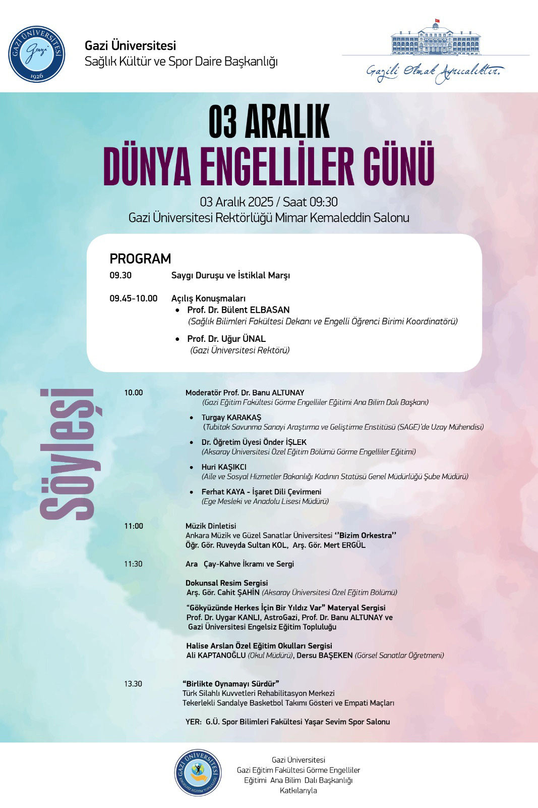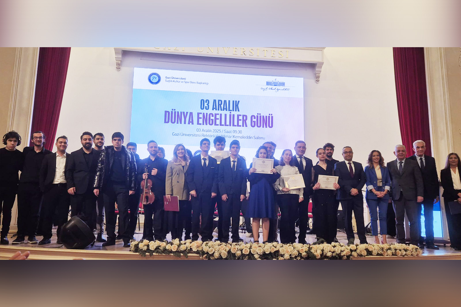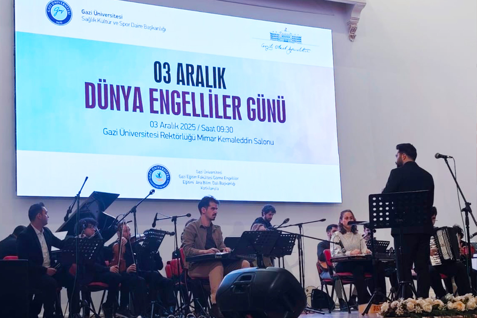 3 Aralık Dünya Engelliler Günü kapsamında Gazi Üniversitesi ev sahipliğinde üniversitemiz Bizim Orkestra topluluğu konser verdi. Gazi Üniversitesi Rektörlüğü Mimar Kemaleddin Salonu’nda gerçekleştirilen konser, izleyicilerden büyük beğeni topladı.
