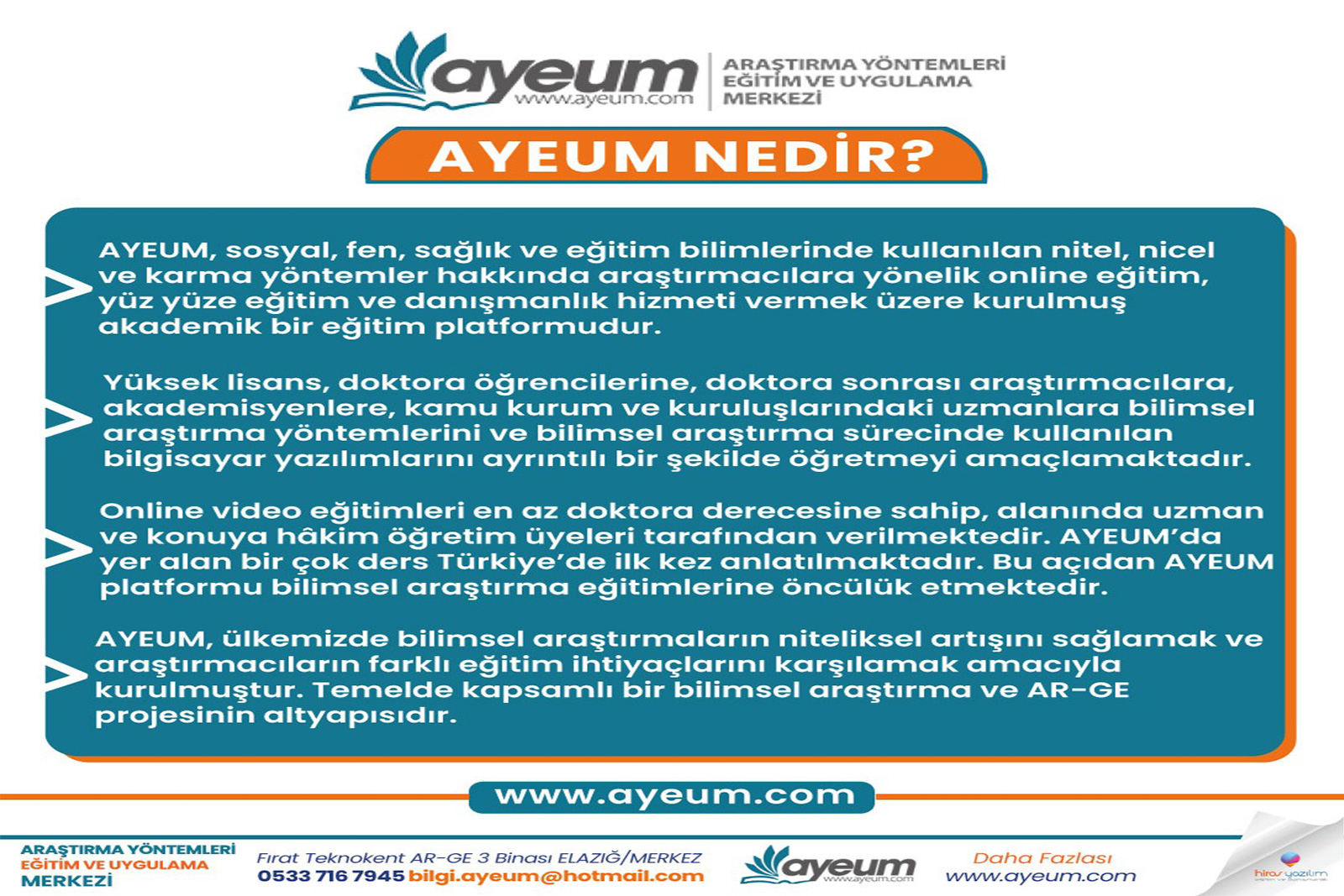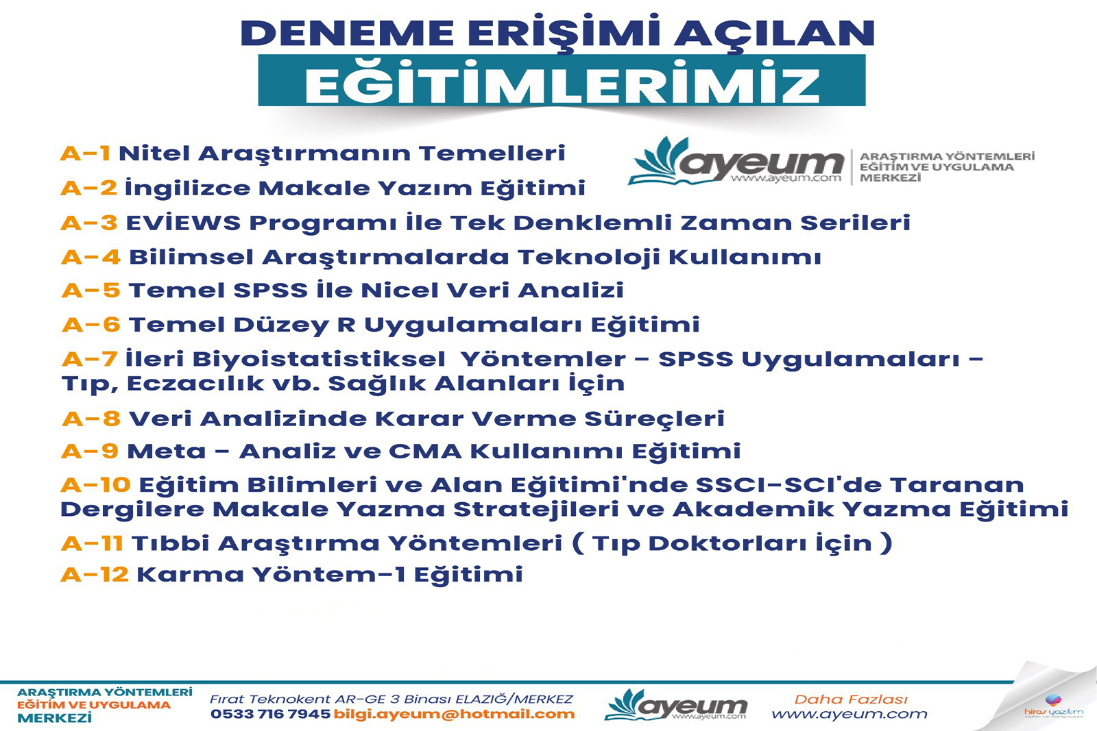 AYEUM, sosyal, fen, sağlık ve eğitim bilimlerinde kullanılan nitel, nicel ve karma yöntemler hakkında araştırmacılara yönelik online eğitim, yüz yüze eğitim ve danışmanlık hizmeti veren akademik bir eğitim platformudur.