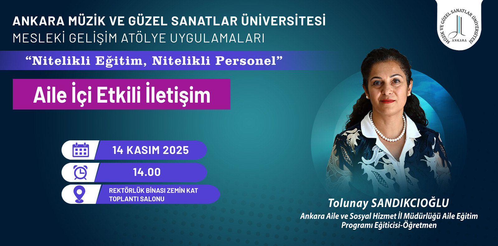 Cumhurbaşkanlığı tarafından “Aile Yılı” ilan edilmesi ve Üniversitemiz Hizmet İçi Eğitim kapsamında “Aile İçi Etkili İletişim” konulu eğitim Ankara Aile ve Sosyal Hizmet İl Müdürlüğü Aile Eğitim Programı Eğiticisi-Öğretmen Tolunay SANDIKCIOĞLU tarafından gerçekleştirilecektir.