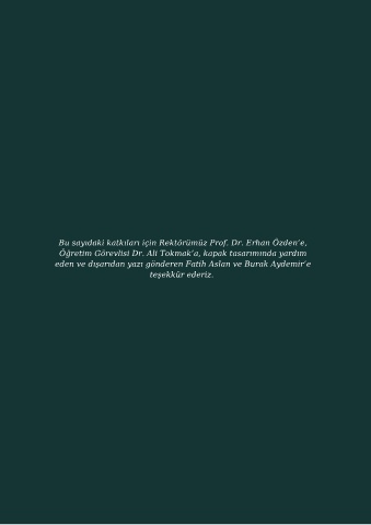 Bu sayıdaki katkıları için Rektörümüz Prof. Dr. Erhan Özden’e, Öğretim Görevlisi Dr. Ali Tokmak’a, kapak tasarımında yardım eden ve dışarıdan yazı gönderen Fatih Aslan ve Burak Aydemir’e teşekkür ederiz.
