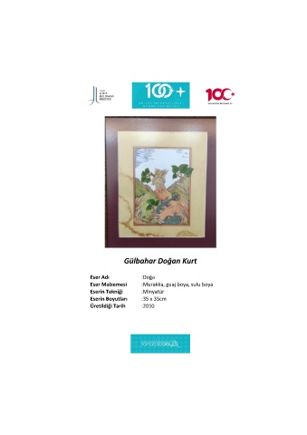 Gülbahar Doğan Kurt Eser Adı :Doğa Eser Malzemesi :Murakka, guaj boya, sulu boya Eserin Tekniği :Minyatür Eserin Boyutları :35 x 35cm Üretildiği Tarih :2010