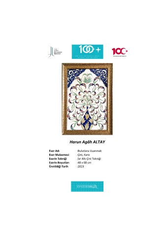 Harun Agâh ALTAY Eser Adı :Bulutlara Uzanmak Eser Malzemesi :Çini, Karo Eserin Tekniği :Sır Altı Çini Tekniği Eserin Boyutları :48 x 68 cm Üretildiği Tarih :2023