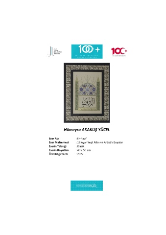 Hümeyra AKAKUŞ YÜCEL Eser Adı :Er-Rauf Eser Malzemesi :18 Ayar Yeşil Altın ve Artistik Boyalar Eserin Tekniği :Klasik Eserin Boyutları :40 x 50 cm Üretildiği Tarih :2022