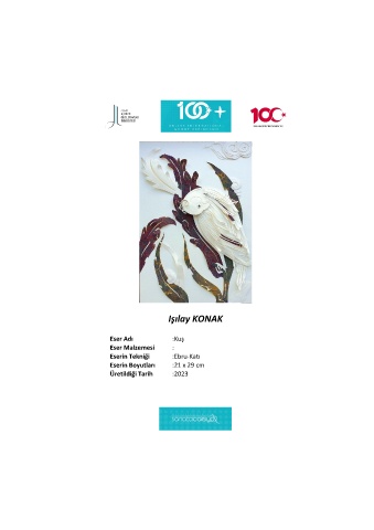 Işılay KONAK Eser Adı :Kuş Eser Malzemesi : Eserin Tekniği :Ebru-Katı Eserin Boyutları :21 x 29 cm Üretildiği Tarih :2023