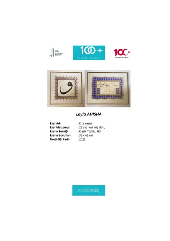 Leyla AHISHA Eser Adı :Kıta Yazısı Eser Malzemesi :22 ayar ezilmiş altın, Eserin Tekniği :Klasik Tezhip, Hat Eserin Boyutları :35 x 45 cm Üretildiği Tarih :2022