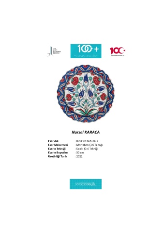 Nursel KARACA Eser Adı :Birlik ve Bütünlük Eser Malzemesi :Mertaban Çini Tabağı Eserin Tekniği :Sıraltı Çini Tekniği Eserin Boyutları :30 cm Üretildiği Tarih :2022