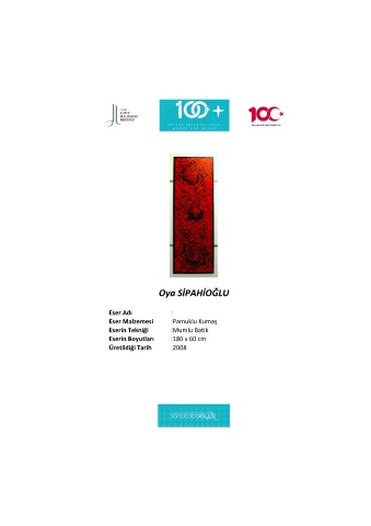 Oya SİPAHİOĞLU Eser Adı : Eser Malzemesi :Pamuklu Kumaş Eserin Tekniği :Mumlu Batik Eserin Boyutları :180 x 60 cm Üretildiği Tarih :2008