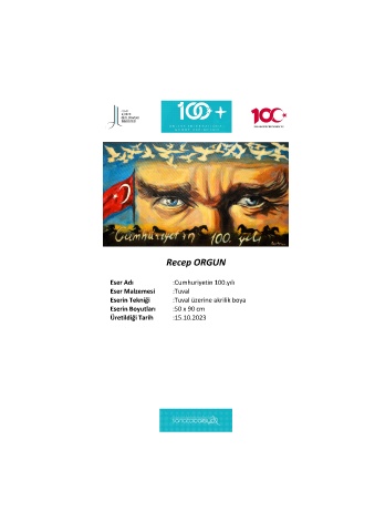 Recep ORGUN Eser Adı :Cumhuriyetin 100.yılı Eser Malzemesi :Tuval Eserin Tekniği :Tuval üzerine akrilik boya Eserin Boyutları :50 x 90 cm Üretildiği Tarih :15.10.2023