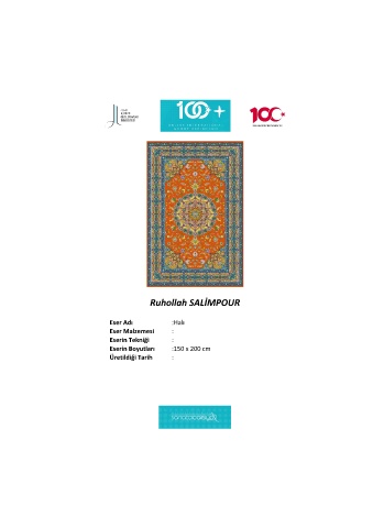 Ruhollah SALİMPOUR Eser Adı :Halı Eser Malzemesi : Eserin Tekniği : Eserin Boyutları :150 x 200 cm Üretildiği Tarih :