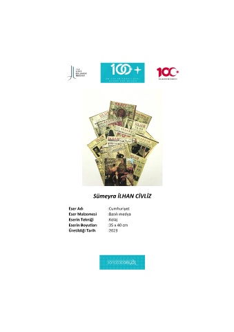 Sümeyra İLHAN CİVLİZ Eser Adı :Cumhuriyet Eser Malzemesi :Basılı medya Eserin Tekniği :Kolaj Eserin Boyutları :35 x 40 cm Üretildiği Tarih :2023