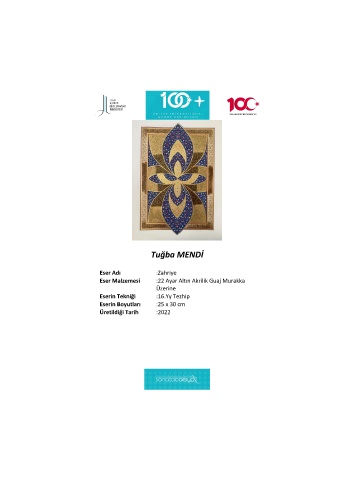 Tuğba MENDİ Eser Adı :Zahriye Eser Malzemesi :22 Ayar Altın Akrilik Guaj Murakka Üzerine Eserin Tekniği :16.Yy Tezhip Eserin Boyutları :25 x 30 cm Üretildiği Tarih :2022
