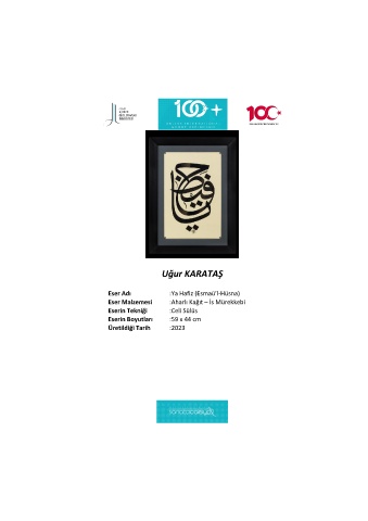 Uğur KARATAŞ Eser Adı :Ya Hafiz (Esmaü’l-Hüsna) Eser Malzemesi :Aharlı Kağıt – İs Mürekkebi Eserin Tekniği :Celi Sülüs Eserin Boyutları :59 x 44 cm Üretildiği Tarih :2023