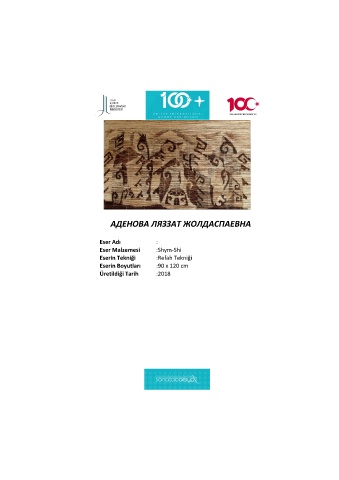 АДЕНОВА ЛЯЗЗАТ ЖОЛДАСПАЕВHА Eser Adı : Eser Malzemesi :Shym-Shi Eserin Tekniği :Refah Tekniği Eserin Boyutları :90 x 120 cm Üretildiği Tarih :2018