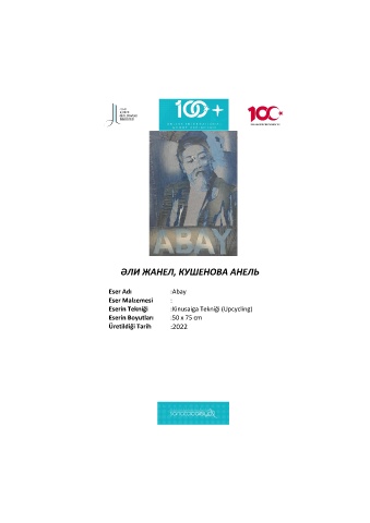 ӘЛИ ЖАНЕЛ, КУШЕНОВА АНЕЛЬ Eser Adı :Abay Eser Malzemesi : Eserin Tekniği :Kinusaiga Tekniği (Upcycling) Eserin Boyutları :50 x 75 cm Üretildiği Tarih :2022