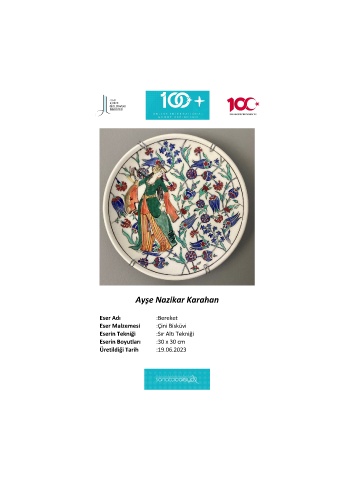 Ayşe Nazikar Karahan Eser Adı :Bereket Eser Malzemesi :Çini Bisküvi Eserin Tekniği :Sır Altı Tekniği Eserin Boyutları :30 x 30 cm Üretildiği Tarih :19.06.2023