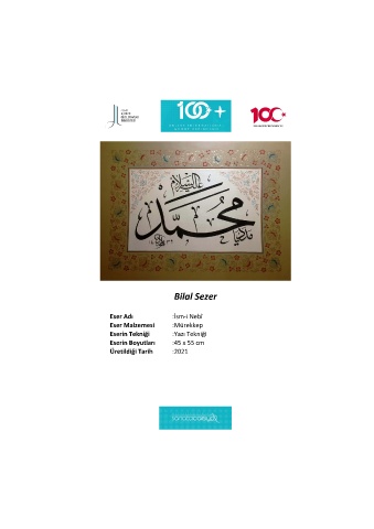 Bilal Sezer Eser Adı :İsm-i Nebî Eser Malzemesi :Mürekkep Eserin Tekniği :Yazı Tekniği Eserin Boyutları :45 x 55 cm Üretildiği Tarih :2021