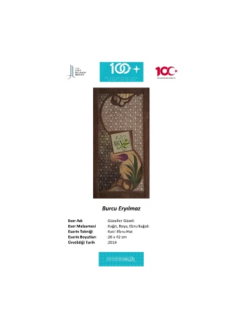Burcu Eryılmaz Eser Adı :Güzeller Güzeli Eser Malzemesi :Kağıt, Boya, Ebru Kağıdı Eserin Tekniği :Katı’-Ebru-Hat Eserin Boyutları :26 x 42 cm Üretildiği Tarih :2014