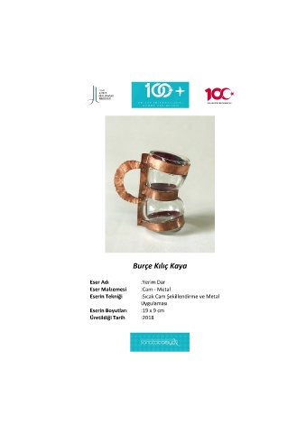 Burçe Kılıç Kaya Eser Adı :Yerim Dar Eser Malzemesi :Cam - Metal Eserin Tekniği :Sıcak Cam Şekillendirme ve Metal Uygulaması Eserin Boyutları :19 x 9 cm Üretildiği Tarih :2018