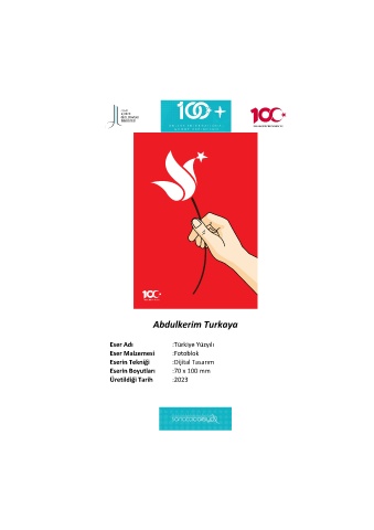 Abdulkerim Turkaya Eser Adı :Türkiye Yüzyılı Eser Malzemesi :Fotoblok Eserin Tekniği :Dijital Tasarım Eserin Boyutları :70 x 100 mm Üretildiği Tarih :2023