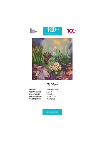 Elif Bilgen Eser Adı :Denizden Gelen Eser Malzemesi :T.Ü.K.T Eserin Tekniği :T.Ü.A.B Eserin Boyutları :83,5 x 35 cm Üretildiği Tarih :05.08.2022