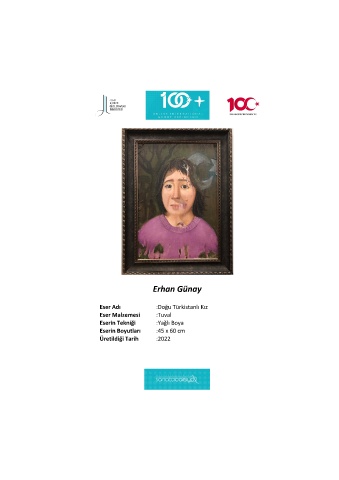 Erhan Günay Eser Adı :Doğu Türkistanlı Kız Eser Malzemesi :Tuval Eserin Tekniği :Yağlı Boya Eserin Boyutları :45 x 60 cm Üretildiği Tarih :2022