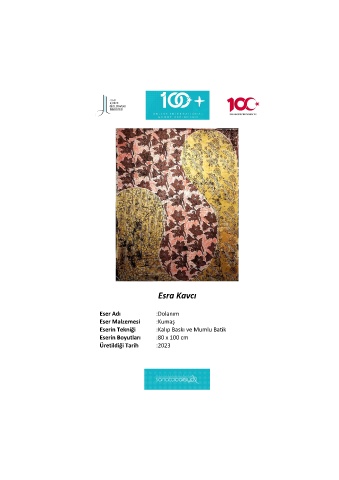 Esra Kavcı Eser Adı :Dolanım Eser Malzemesi :Kumaş Eserin Tekniği :Kalıp Baskı ve Mumlu Batik Eserin Boyutları :80 x 100 cm Üretildiği Tarih :2023