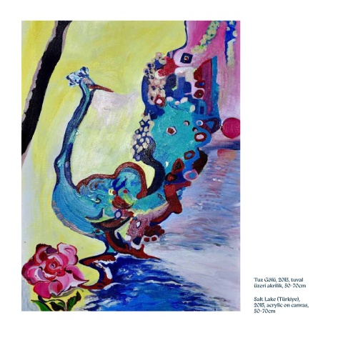 of roses with acrylic paint inspired by calligraphy. Following a trip to Konya, she now integrates Mevlana and whirling dervishes with nature and portrays their universal
