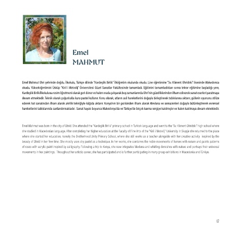 Emel Mahmut was born in the city of Ohrid. She attended the “Kardeşlik Birlik” primary school in Turkish language and went to the “Sv. Kliment Ohridski” high school where