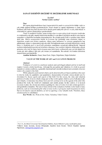 Anahtar Kelimeler: Sanat, Sanat Eseri, Değer, Değerleme, Değer Kriterleri